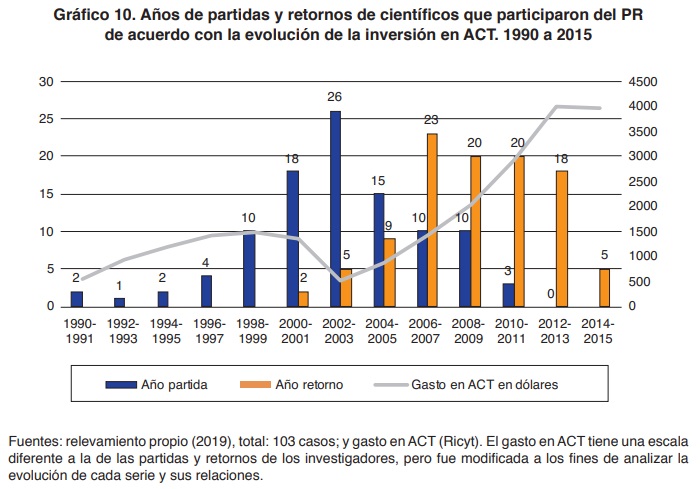 Desde 2003, como se señaló, comienza a recuperarse la inversión en ACT y se da una apertura del sistema a través del aumento de cargos académicos y de becas. Acompañando ese ciclo ascendente de la inversión se registra un crecimiento desde ese año de los investigadores que volvieron con el PR. Es significativo que la mayor parte de los retornos, el 79,4%, se haya dado entre 2006 y 2013, cuando la inversión en ACT se recupera, como queda expresado en el gráfico. Esto coincide, además, con un empeoramiento de las condiciones laborales para los académicos en Estados Unidos y Europa. A partir de 2013, se da una caída abrupta de los retornos, no registrándose casos en 2015, tendencia que acompaña el amesetamiento de la inversión en ACT en Argentina hasta 2015