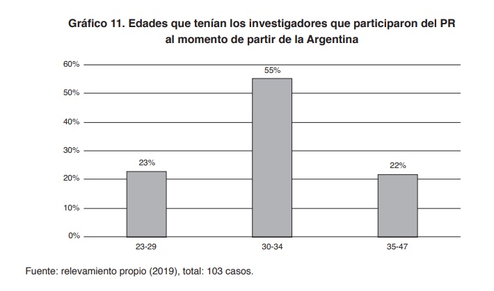 Esto puede observarse más de cerca si analizamos las edades que tenían los científicos al momento de partir de Argentina. En el Gráfico 11 se observa que la mayoría lo hizo antes de los 34 años (78%), lo cual puede estar dando cuenta de que el viaje al exterior se produjo como parte de una trayectoria habitual de formación en esta área disciplinar tendiente a la realización de un posdoctorado; se trata de migraciones con un propósito específico. Sin embargo, también existe un 22% de los investigadores que partieron del país teniendo 35 años o más, lo cual abre interrogantes sobre las motivaciones que empujaron a la toma de tales decisiones a personas que tenían al momento de partir una amplia trayectoria en la Argentina.