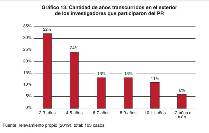 Con respecto al tiempo de permanencia en el exterior, puede observarse en el Gráfico 13 que la mayor parte de los investigadores estuvo entre dos y siete años, lo cual coincide con lo señalado en otros estudios: Bayle (2015), en su investigación sobre científicos que regresaron al CONICET a través del PR, indica que del 61,5