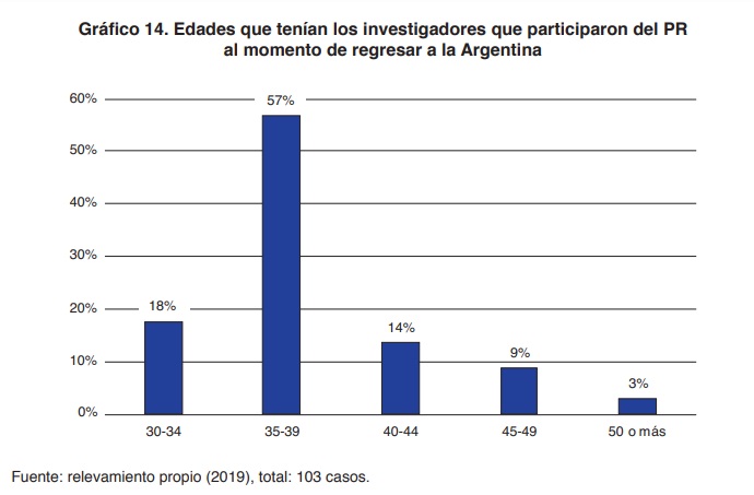 Sin embargo, la situación de los mercados académicos es un aspecto que puede haber motorizado las migraciones de retorno y que puede estar incidiendo en el regreso de una parte importante del universo, especialmente de los más jóvenes que transitan una etapa posdoctoral y que desarrollaron migraciones destinadas a un propósito específico. Para el caso del grupo que retornó luego de estar muchos años fuera del país y haber cumplido los 45 años, que representan el 11% del total, la situación de los mercados académicos externos probablemente no haya sido tan importante a la hora de decidir el regreso. En este caso pueden haber incidido el retiro al terminar con la vida laboral activa, aspectos afectivos, culturales y la necesidad de hacer una devolución al país en términos de conocimientos. En todos los casos, además, opera el propio PR como posibilidad de facilitar el retorno, ya que plantea una ventanilla permanente de postulación CONICET para aquellos que están en el exterior.
