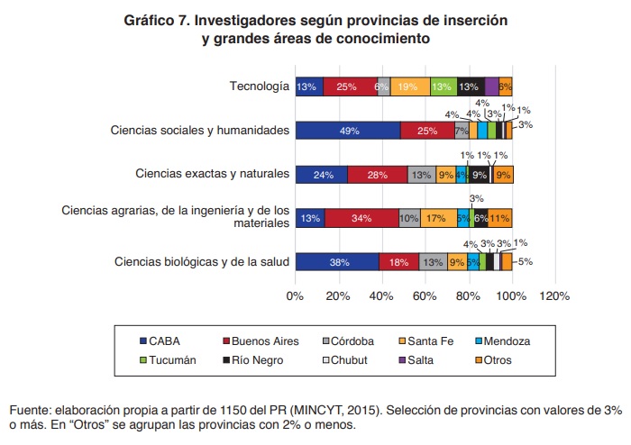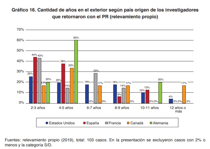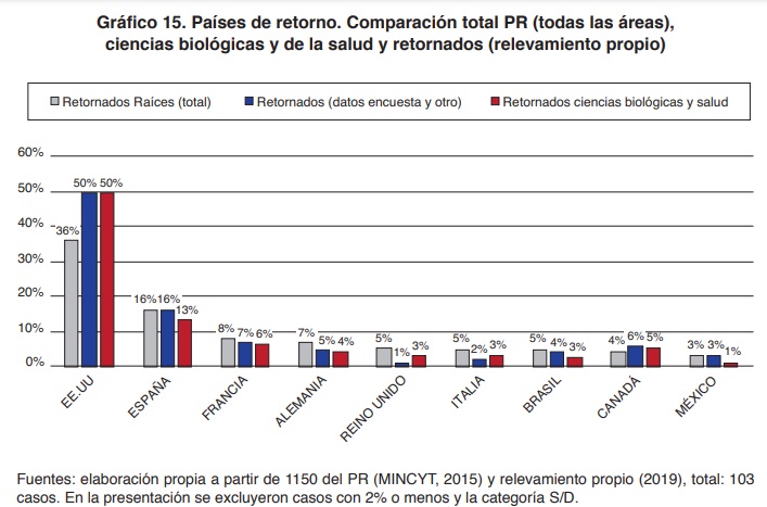 La última conclusión refiere a la gran concentración de investigadores del PR en unos pocos países de origen: la mayor parte de ellos provino de Estados Unidos, España, Francia, Alemania, Reino Unido, Italia y Canadá, distribución que se enmarca en un proceso de aglomeración cada vez mayor de investigadores en un pequeño conjunto de países desarrollados. Esto se debe, en parte, al despliegue de políticas inmigratorias selectivas desde los países de la OCDE desde la década del 90.