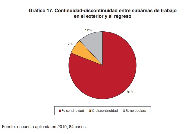 Además, se hallaron continuidades en relación con sus subáreas de trabajo en las que los científicos se desempeñaban en el exterior y al regresar a la Argentina; es decir: entre campos de conocimientos como la biología molecular, la bioquímica, la microbiología, la salud, la biología celular, la ecología, la endocrinología reproductiva, la microbiología, las neurociencias, la veterinaria, la zoología. Se detectó que el 81% de los investigadores tuvo continuidad en ese plano, mientras que el 7% de los casos respondió que no tuvo continuidad.