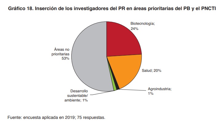 Con respecto al grado de inserción de los investigadores que volvieron en las áreas consideradas prioritarias por el PB y el PNCTI, se observa que más de la mitad (53%) no localizó su trabajo en áreas consideradas prioritarias. El 47% que sí lo hizo fue en biotecnología (24%), salud (20%), agroindustria (1%) y ambiente (1%). No se registraron casos de investigadores que trabajen en áreas prioritarias como TIC, nanotecnología, energía y desarrollo social. Entre las causas de la falta de inserción de los científicos repatriados en las áreas consideradas prioritarias, puede indicarse la ausencia de articulación de los instrumentos del PR con los planes —con excepción de los PIDRI-ANPCYT—, de modo que los criterios de selectividad de las personas repatriadas se apoyen en estas áreas prioritarias.