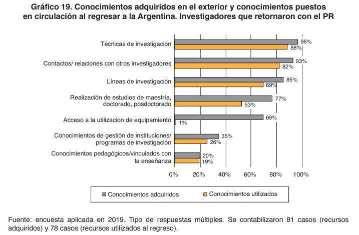 Otra conclusión refiere a que el PR puede ser visto como un instrumento desarrollado por el Estado en función de incrementar la masa crítica de científicos y de conocimientos en el ámbito local. Si se parte del dato de que entre 2003 y 2015 se sumaron 25.638 investigadores nuevos a la estructura científica de nuestro país, los 1150 investigadores que aplicaron al PR representaron el 0,4% del total en 2015. Esta participación de los repatriados bajo el programa puede resultar relativamente baja en términos porcentuales, pero toma otra relevancia si se tiene en cuenta que gran parte de los conocimientos traídos por los científicos al regresar a la Argentina pudieron ser puestos en uso. En este sentido, los científicos adquirieron distintos tipos de conocimientos en el exterior como técnicas de investigación; contactos con otros científicos; líneas de investigación; realización de estudios de maestría, doctorado, posdoctorado; uso de equipamiento; conocimientos de gestión; y conocimientos pedagógicos, que fueron puestos mayormente en circulación al regresar a la Argentina.