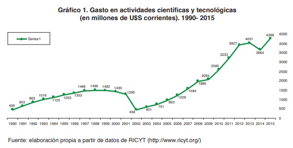 Es necesario señalar que el crecimiento del gasto fue modesto si se lo compara con complejos científicos de otros países, incluso latinoamericanos, y se lo mide en términos relativos; pero asimismo fue lo suficientemente fuerte como para traccionar a la suba a los principales indicadores del sistema. Como señalan Albornoz y Gordon (2011), el aumento obedece en mayor medida a un período de expansión económica que a la asignación de mayor prioridad a la ciencia y la tecnología por parte de los agentes públicos y privados: la inversión en I+D de 2008, medida en dólares corrientes PPC, fue 157% superior a la de 2002, mientras que la inversión en I+D como porcentaje del PBI de 2008 fue 15% superior a la de 1999.