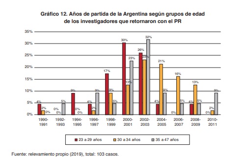 Con respecto a la migración de retorno de los científicos argentinos, existen muy pocos estudios estadísticos. Un trabajo de la OCDE (2008) muestra que la tasa de retorno de los emigrados argentinos a Estados Unidos y España —en general, sin considerar el nivel educativo o la ocupación— fue en 2001 del 3,8% y 4,3%, por debajo del 9,2% y 7,9% de Brasil, por ejemplo (OCDE, 2008). En cuanto al retorno de investigadores, en particular la investigación de Meyer (2015) muestra que los argentinos retornan más que los uruguayos y los colombianos. Ese estudio indica, además, que los argentinos que regresaron al país pasaron a menudo por Estados Unidos, por el Reino Unido, y con menor frecuencia por España, lo cual nos habla de una migración de tipo step migration o secuencial, presente en un tercio de las personas que volvieron a Argentina.