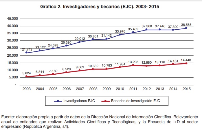 Durante esta etapa se robusteció al CONICET, a la vez que comenzó un proceso de fuerte incorporación de investigadores y becarios en el organismo y las universidades (Albornoz y Gordon, 2011). Desde 2003 se observa el crecimiento en la cantidad de investigadores de jornada completa (EJC), debido fundamentalmente al impulso dado desde el CONICET. Como señalan Albornoz y Gordon (2011), desde esa institución se amplió significativamente el número de becas para estudios de posgrado y reabrió el ingreso a la carrera de investigador, que estaba congelado desde mediados de la década de 1990 (Albornoz y Gordon, 2011). En ese sentido, en el período 2003- 2015 los investigadores de todo el país pasaron de ser 21.743 a 38.565, mientras que los becarios pasaron de 5624 a 14.440. Es decir: aumentaron en 77,36% y 156,7%, respectivamente, como queda expresado en el siguiente gráfico.