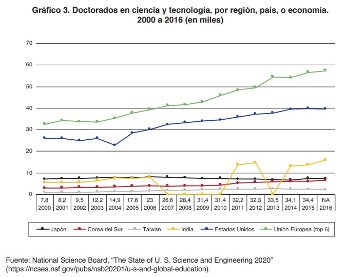 Al mismo tiempo, en los países de la OCDE se registra un aumento sostenido de la masa de doctores graduados. En el período de nuestro interés se observa que la Unión Europea (en particular los seis países más poderosos: Francia, Alemania, Italia, España, Suiza y Reino Unido) y Estados Unidos, encabezan ese proceso en todas las áreas de conocimiento y en el área de ciencia y tecnología en especial (NSB, 2020):
