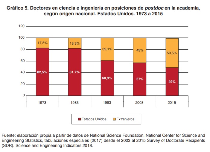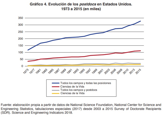 El crecimiento de los postdocs también tuvo lugar en Europa. Como sostienen Fumasoli et al.: “La fase de postdoc se convierte en un paso normal en la carrera académica y, debido al aumento del número de estudiantes de doctorado, un filtro para ingresar a la profesión académica” (2015, p. 212). Lo que solía ser un paso convencional para las ciencias naturales, en la actualidad se tornó en parte de todas las trayectorias académicas. Se debe considerar, además, la creciente presencia de doctores extranjeros en posiciones posdoctorales en Estados Unidos. Como puede observarse en el siguiente