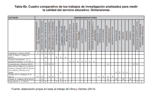 En la Tabla 8b se pueden apreciar las dimensiones y factores utilizados por cada estudio, donde se observan dimensiones relacionadas a la organización institucional, la organización académica, los profesores y a los alumnos. Se observa que las más elegidas por los autores son, en primer lugar, los contenidos del plan de estudios, y le siguen la competencia de los profesores, la capacidad de respuestas del personal y la efectividad de los procesos administrativos. Claramente se visualiza que es una evaluación intrínseca de la institución.