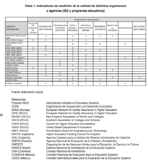 A partir de la información que se presenta en la Tabla 1 se observa que las propuestas de medición de la calidad de IES (Proyecto INES, ENQA, CIHE-NEASCC, SACS, HEFCE, AQU, SINAES, CNA, CONAEVA, CIEES, SINAES, CONAP, CONEAU y UNESCO) se refieren casi en su totalidad a indicadores para definir la misión y estructura organizativa de la universidad. Se evidencia que la mayoría de las agencias y los organismos consideran principalmente, respecto a las IES, los indicadores relacionados con los procesos educativos o la enseñanza, el capital humano y los recursos, la organización institucional y el rendimiento estudiantil.