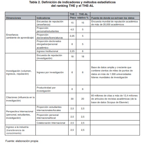 El THE, como se muestra en la Tabla 2, utiliza 13 indicadores de rendimiento agrupados en cinco áreas o dimensiones, cuidadosamente ajustados para proporcionar las comparaciones más completas y equilibradas.