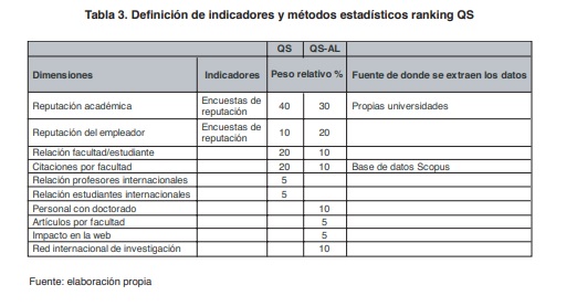 Puede observarse que estos rankings tienden a sintetizar y suministrar datos cuantitativos sobre el prestigio o la reputación de los sistemas educativos y de las universidades (Orozco et al., 2015). Los rankings definen dimensiones y le dan un cierto peso relativo a cada una, lo que a su criterio define la calidad de una universidad, al establecer cuál es mejor que otra.