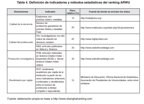 Actualmente, clasifica todos los años la información de aproximadamente 1800 universidades y se publican las 1000 mejores instituciones. Se basa en seis indicadores objetivos agrupados en cuatro criterios o dimensiones como los que se observan en la Tabla 4. Para cada indicador se asigna un valor máximo de 100 a la mejor universidad y para las otras universidades el indicador se calcula como un porcentaje proporcional de ese valor máximo. En caso de que la distribución de los datos estadísticos de cualquier indicador presente una distorsión significativa, se emplean técnicas estándar de estadística para ajustar el indicador cuando sea necesario ..