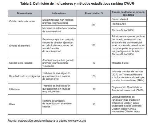 El CWUR comenzó como un proyecto en Jeddah, Arabia Saudita, con el fin de clasificar a las 100 mejores universidades del mundo. Ante la difusión y el interés de los medios y las universidades de ampliarlo, a partir de 2019 pasó de clasificar 1000 a 2000 de 20.000 universidades mejores de todo el mundo, pasando a ser el ranking académico global más grande del mundo. Mide desde 2012 la calidad de la educación y la formación de estudiantes, el prestigio de los miembros de las facultades y la calidad de sus investigaciones. No depende de encuestas ni de datos suministrados por las universidades (Albornoz y Osorio, 2018). Para ello utiliza siete indicadores objetivos y robustos para clasificar a las 2000 universidades más importantes del mundo. En la columna “Fuente” de la Tabla 5 se indica en qué se basa este ranking para obtener los datos para cada indicador.