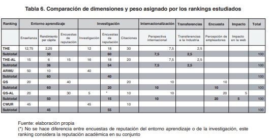 En la Tabla 6 se presenta una síntesis de dimensiones, indicadores y peso relativo respecto del total. Con el objeto de comparar los rankings se definieron cinco dimensiones -entorno aprendizaje, investigación, internacionalización, transferencia, encuesta e impacto-, cada una conformada por los indicadores utilizados por cada ranking.