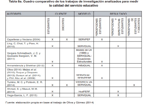 Los instrumentos de medición de los servicios públicos, entre ellos la educación superior, miden las expectativas y las percepciones de la calidad del servicio basada en quien recibe o utiliza el servicio (el cliente) (Araya-Castillo, 2013; Oliva y Gómez, 2014).