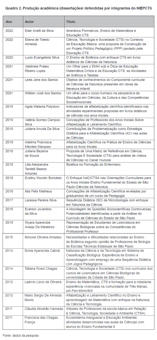 Quanto as produções acadêmicas desenvolvidas pelo NIEPCTS, o Quadro 2, apresenta as pesquisas de mestrado (dissertações), já oQuadro 3, as pesquisas de doutorado (teses).