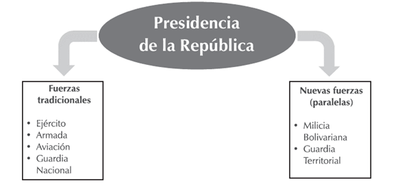 Distinguimos así dos fases. Una primera que hemos descrito, enfocada sobre el escenario interno, y que es la reestructuración de las relaciones civiles-militares. Se pasa del modelo del soldado neutro, no deliberante, a otro comprometido de lleno con el proyecto revolucionario. La segunda fase es el cambio de orientación en la Defensa Nacional. Ella pasa de un enfoque convencional de enfrentamiento entre Estados (principalmente con Colombia) a un enfoque asimétrico apto contra Estados Unidos.