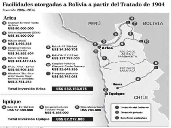 Un esquema de las facilidades proporcionadas por Chile a Bolivia para materializar lo acordado en 1904, deja en evidencia el gasto planificado recientemente al respecto. Cabe señalar que ambos Estados han tenido problemas con el tendido del ferrocarril, el pilar de conectividad dispuesto por el Tratado. En razón de ello, en la década de los noventa se abrió la Ruta CH 11 que une Arica con Chungará y Tambo Quemado. Sin embargo, la rehabilitación de la línea chilena del ferrocarril que fuera concluida en el 2012, tras 10 años de interrupción por quiebra, no ha habilitado por Bolivia en su línea dispuesta desde Viacha a La Paz.