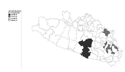 Figure 2 shows the violence index of 1999 and 2014, which is used to analyze the spatial agglomeration of insecurity. What we find is that the high-high growth of insecurity occurred in the municipalities of Acapulco de Juárez, Coyuca de Benitez and Chilpancingo de Los Bravos (darker-upper color), while in 2014 there were only two municipalities that were belonging to a violent cluster /o cluster of violence.