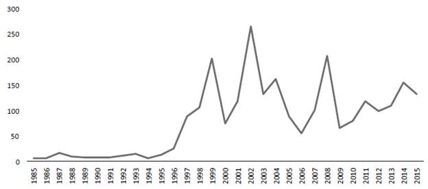 Con respecto a la ayuda oficial al desarrollo solo se puede deducir su alcance por la dificultad de obtener o estimar cifras en la relación con China y Corea del Sur; una estrategia de ayuda puede ser la inversión en proyectos de desarrollo, así como en bienes y especies, algo que no se contabiliza. Asimismo, este tipo de ayuda otorgada por otros Estados o Instituciones Internacionales se da primordialmente a través de productos: comida, medicinas y recursos energéticos, por ejemplo. A propósito, podemos encontrar que, de acuerdo con el Banco Mundial (World Bank, 2017), durante 2015, Corea del Norte recibió un poco más de US$ 131 millones por parte del Comité de Ayuda al Desarrollo de la Organización para la Cooperación y el Desarrollo Económicos (OCDE, su sigla en inglés). Esto se puede observar en la figura 2.