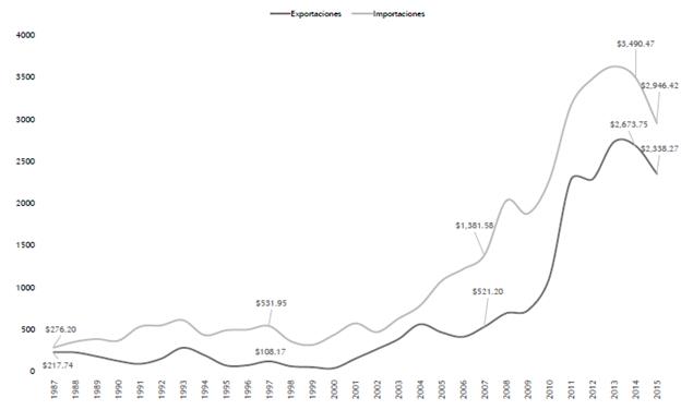 El comercio exterior de Corea del Norte se ha concentrado en China, su principal socio, en tal proporción que podría pensarse en una relación de dependencia casi absoluta, con déficit en su balanza de pagos, como se puede observar en las figuras 8 y 9.