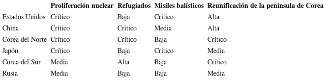 Al igual que lo sucedido con las pláticas de Cuatro Partes, las pláticas iniciadas en 2003 sólo calmaron la situación hasta 2008, y en 2009, cuando Corea del Norte lanzó su segunda prueba nuclear, Estados Unidos, Japón y Corea del Sur desestimaron avanzar en los diálogos. De nuevo, puede entenderse que la imposibilidad de hallar una solución residía en la divergencia de los intereses de los Estados. De acuerdo con Park (2005), pese a que las negociaciones tenían como tema central el desarrollo del programa nuclear, existían otros temas fundamentales con relación a la crisis que debían tratarse y resolverse en conjunto. Sin embargo, cada Estado tenía distintas prioridades respecto a estos asuntos, razón por la que no se podía avanzar en las negociaciones, tal como se observa en la tabla 2. A lo anterior debemos sumar el hecho de que siempre existió una confrontación entre las intenciones de EE. UU. y de Corea del Norte, pues el primer país establecía que el programa de desarrollo nuclear debía parar si se quería negociar, mientras que el segundo promulgó que las negociaciones debían tratar otros temas que garantizaran su seguridad, y que el desarrollo de armas nucleares era un asunto de autodefensa para proteger su supervivencia (China Daily, 2003).
