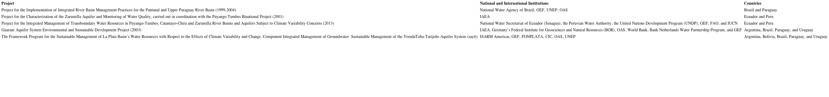 The projects developed in South America regarding transboundary aquifers involve many countries and international organizations, as shown in Table 1.