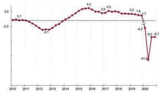 For practical purposes, all this can be examined in the report of the Instituto Nacional de Estadística (2021), which highlights, among other issues, that consumption, transport, or industry were hit by the pandemic, suffering abrupt falls that have been overcome as the year progresses. In 2020, the Spanish economy experienced the most significant drop since the Civil War, with a decline of 11 %. In the eurozone, GDP fell 6.8 %, a figure that far exceeds the 4.9 % of the Great Recession of 2009 (Figure 1).