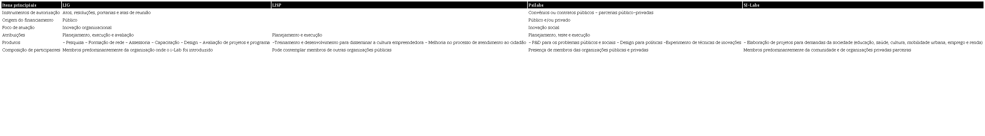Com base nas características citadas anteriormente, na tabela 1 é apresentada a síntese da proposta de caracterização com base em seis itens: instrumentos de autorização; origem do financiamento; foco de atuação; atribuições; produtos e composição de participantes. Vale ressaltar que a proposta apresentada de caracterização de i-Labs não necessita seguir os itens apresentados de forma sequencial ou sob o ordenamento utilizado nesta pesquisa