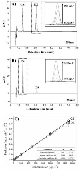 The LODs and LOQs were 0.0670 µg L-1 and 0.209 µg L-1 to CZ and 0.130 µg L-1 and 0.435 µg L-1 to DZ. These results were close to those described in the literature (Madureira et al. 2010; Ebert et al. 2014).