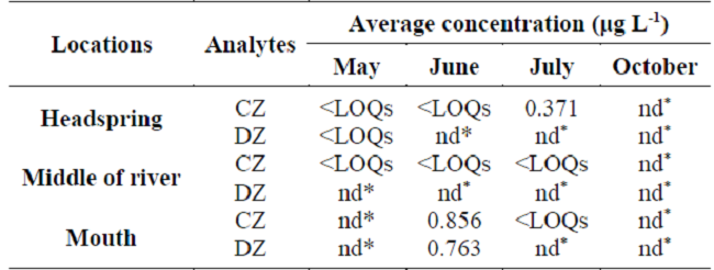 CZ were found in the Tiber River (Italy) at the concentration level of 0.063 µg L-1 (Patrolecco et al., 2013). Madureira et al. (2010) found CZ at 0.0327 µg L-1 and did not detect DZ in the Douro River estuary (Portugal). Campanha et al. (2015) found CZ in 71% of analyzed samples between 0.50 and 0.215 µg L-1 in the Monjolinho River, São Carlos, SP. According Clara et al. (2004), CZ could be considered a qualified parameter for detecting wastewater in aquatic environments due to its high persistence.