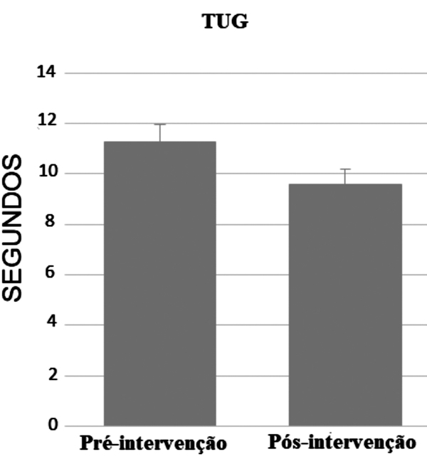 O teste “Timed Up And Go” obteve um valor de p=0,005, indicando que houve uma diferença dos resultados, mostrando assim a melhora desses idosos no trajeto, visto que no teste quanto menor o tempo do percurso pressupõe-se que haja uma redução no risco de quedas (figura 1).