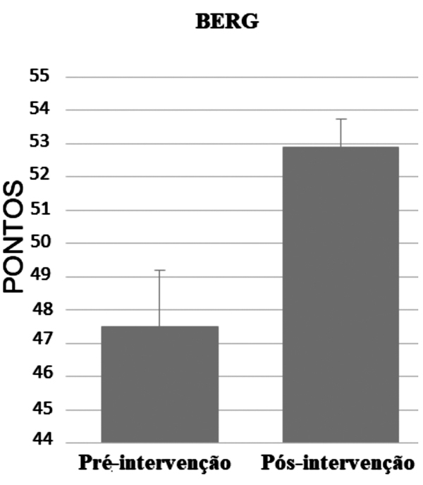 O teste de Berg obteve um valor de p 0,001, indicando que houve uma melhora estatisticamente sigficativa, visto que no teste a pontuação abaixo de 50 é preditiva de quedas (figura 2).