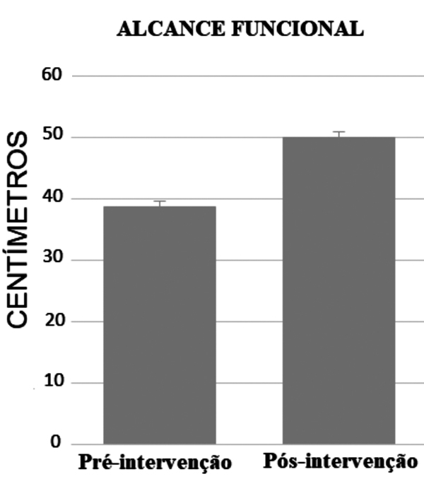 O teste do Alcance Funcional obteve um valor p 0,001, indicando que houve uma melhora estatisticamente sigificativa, visto que no teste deslocamento abaixo de 15cm indicam risco de quedas (figura 3).