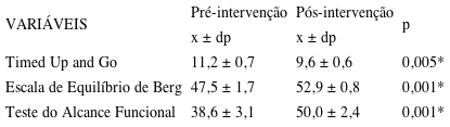 Ao comparar o efeito do programa de treinamento com Nintendo WII® no equilíbrio dos idosos (Tabela 1), verificou-se diferença significativa (p < 0,05) em todos os testes de equilíbrio (Timed Up and Go, Escala de Equilíbrio de Berg e Teste do Alcance Funcional), evidenciando que o programa de intervenção baseado no Nintendo WII® teve um efeito positivo sobre o equilíbrio dos idosos.