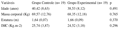Participaram deste estudo 38 indivíduos sedentários, divididos em: grupo controle (GC), formado por 19 participantes saudáveis, e grupo experimental (GE), formado por 19 participantes com dor lombar recorrente inespecífica. Em ambos os grupos, o número de mulheres (12) e homens (7) foi o mesmo. As amostras foram homogêneas quanto às características antropométricas (Tabela 1). Todos os participantes foram recrutados de dentro de uma universidade e a partir de listas de espera de uma clínica escola da comunidade.