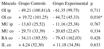 Na comparação dos valores de onset entre os grupos (Tabela 2), houve diferença significativa para o OI contralateral (p= 0,016; Cohen d= 0,82) ao membro superior elevado, em que o GE apresentou resposta mais rápida em relação ao GC.