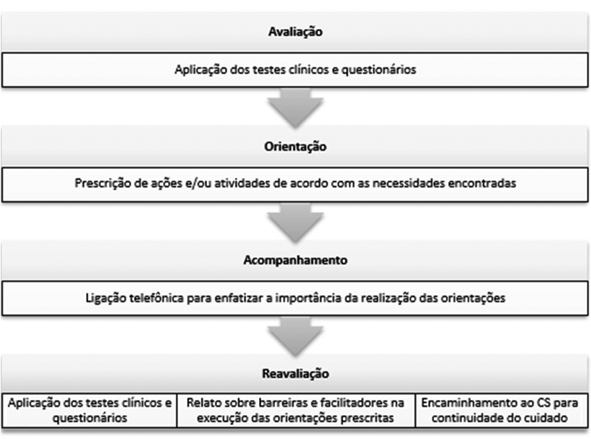 Na segunda visita foram realizadas as orientações específicas, elaboradas a partir das necessidades identificadas na avaliação. Estas orientações foram realizadas através de explicações verbais e material impresso, além de demonstrações para verificar o entendimento e desempenho do paciente. Ainda nesta visita, entregamos o formulário de registro do seguimento das orientações (APÊNDICE A) para o acompanhamento das orientações prescritas, orientando sobre seu preenchimento. O acompanhamento e readequação das orientações prescritas foram realizados através de uma ligação telefônica 15 dias após a entrega das orientações. Neste contato telefônico foi realizada uma breve entrevista sobre o seguimento das orientações a fim de reforçar a importância da execução das orientações, assim como o preenchimento do formulário de registro do seguimento das orientações. Ao final de 30 dias após o recebimento das orientações foi realizada uma reavaliação, quando foi recolhido o formulário de orientações preenchido. Nesta ocasião foi realizada também uma entrevista sobre a execução das orientações a fim de avaliar os facilitadores e barreiras encontrados para a execução do programa de educação. Esta entrevista foi gravada com a finalidade de obter o relato sobre as dificuldades percebidas e se o indivíduo percebeu melhora em realizar as orientações. Caso o indivíduo não tenha percebido melhoras, recebeu novas orientações de acordo com as dificuldades encontradas e foi encaminhado ao Centro de Saúde ao qual é adstrito para dar continuidade do cuidado.