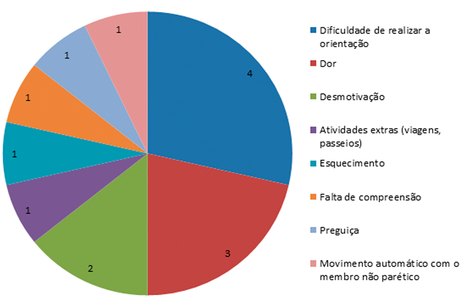 O principal motivo relatado pelos participantes como barreira para a adesão foi a dificuldade de realização das orientações. Durante a visita domiciliar os sujeitos receberam as orientações, as quais foram explicadas verbalmente e demonstradas em figuras ilustrativas através de um folheto impresso. Como cada paciente apresentava dificuldades específicas, as adaptações e orientações foram adequadas a cada caso. O terapeuta orientou os pacientes e, caso apresentassem dificuldades na realização das tarefas, eram feitas modificações com o objetivo de conseguirem realizar as atividades. Por outro lado, Picorelli et al. (2015) relatam que um pior desempenho na atividade funcional não tem impacto direto na falta de adesão ao programa de exercícios domiciliares. Segundo os autores, entendimento da adesão deve ser profundamente investigado, sob aspectos de saúde física, emocional e social, sendo um desafio para os profissionais da saúde25.