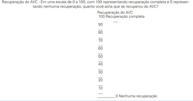 Para o registro de dados clínicos e sociodemográficos dos pacientes foi utilizado um formulário de identificação elaborado pelas autoras. Para quantificar o desempenho cognitivo dos indivíduos foi utilizado o Mini-Exame do Estado Mental (MEEM), a pontuação pode variar de um mínimo de 0, que indica maior grau de comprometimento cognitivo dos indivíduos, até o máximo de 30 pontos, o qual por sua vez corresponde à melhor capacidade cognitiva 15. Com finalidade de avaliar o nível da recuperação sensório-motora de indivíduos que sofreram AVE foi utilizada a Escala de Fulg-Meyer 16, 17. O escore total da escala motora é de 100 pontos, sendo que a pontuação menor ou igual a 50 corresponde a comprometimento grave, entre 51 e 84 comprometimento marcante, entre 85 e 95 comprometimento moderado e maior ou igual a 96 comprometimento leve 16. Para avaliar o grau de independência funcional foi utilizada a Medida da Independência Funcional (MIF), verificando o desempenho do indivíduo em 18 tarefas referentes às subescalas de autocuidados, controle esfincteriano, transferências, locomoção, comunicação e cognição social. Cada item pode ser classificado em uma escala de graus de dependência de sete níveis, sendo o valor 1 correspondente à dependência total e o valor 7 correspondente à normalidade na realização de tarefas de forma independente. Dessa forma, a pontuação pode variar entre 18 e 126 pontos. Para avaliar a saúde relacionada à qualidade de vida foi utilizada a Stroke Impact Scale 3.0 (SIS), composta por 59 itens distribuídos em 8 domínios: força, memória e pensamento, emoção, comunicação, atividade básicas e instrumentais da vida diária (AVDs e AIVDs), mobilidade, função da mão e participação social. Os escores para cada faixa de domínio variam de 0 a 100, sendo que quanto maior a pontuação melhor a qualidade de vida 18. A SIS inclui também uma questão (item 9) para avaliar a percepção global do paciente quanto a sua recuperação. O entrevistado avalia a taxa de sua recuperação através de uma escala visual analógica de 0 a 100, em que “0” significa ausência de recuperação e “100” recuperação completa (ANEXO A)18.