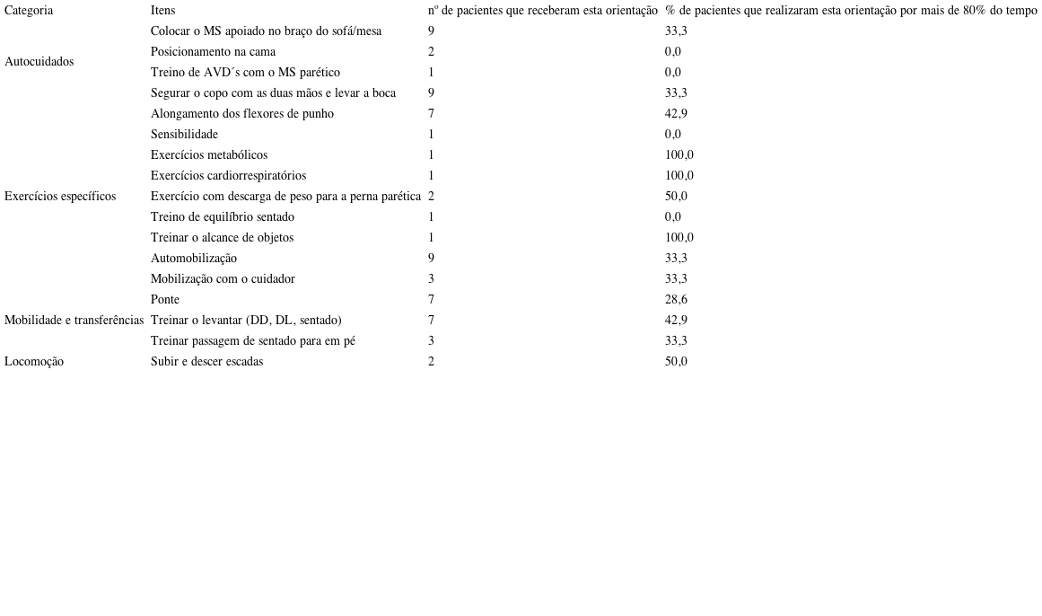 Elaborado pelos autores.Todas as tarefas e exercícios prescritos como orientações foram listadas de acordo com as categorias da MIF. Observou-se que em treze das dezessete tarefas os pacientes aderiram às orientações e propostas, realizando-as por mais de 80% do tempo sugerido (Tabela 2). Porém, quando olhamos para o número de sujeitos que aderiram a cada uma das orientações, vemos que em 14 tarefas menos da metade dos pacientes que receberam a orientação específica a realizou por mais de 80%, sendo que as duas das três tarefas que apresentaram 100% de adesão foram prescritas a apenas um sujeito.