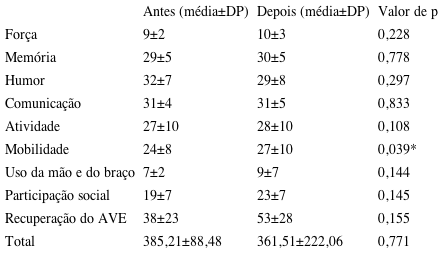 A tabela 3 apresenta os resultados obtidos em relação à SIS antes e após 30 dias da avaliação inicial. Destaca-se que houve uma melhora importante no item mobilidade, com diferença estatisticamente significativa (tabela 3).