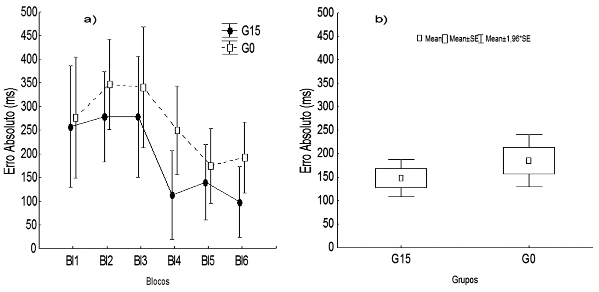 A Figura 1a mostra os dados da precisão do desempenho (EA) na fase de aquisição. O teste utilizado mostrou diferença significativa no fator blocos F(5;14) = 5,68, p = 0,001. O post-hoc LSD detectou que a precisão do desempenho aumentou do quarto bloco (p = 0,04) para o quinto e sexto blocos. Não houve diferença significante no fator grupos F(1;28) = 3,11, p = 0,08, nem interação entre grupos e blocos F(5;14) = 0,43, p = 0,82.