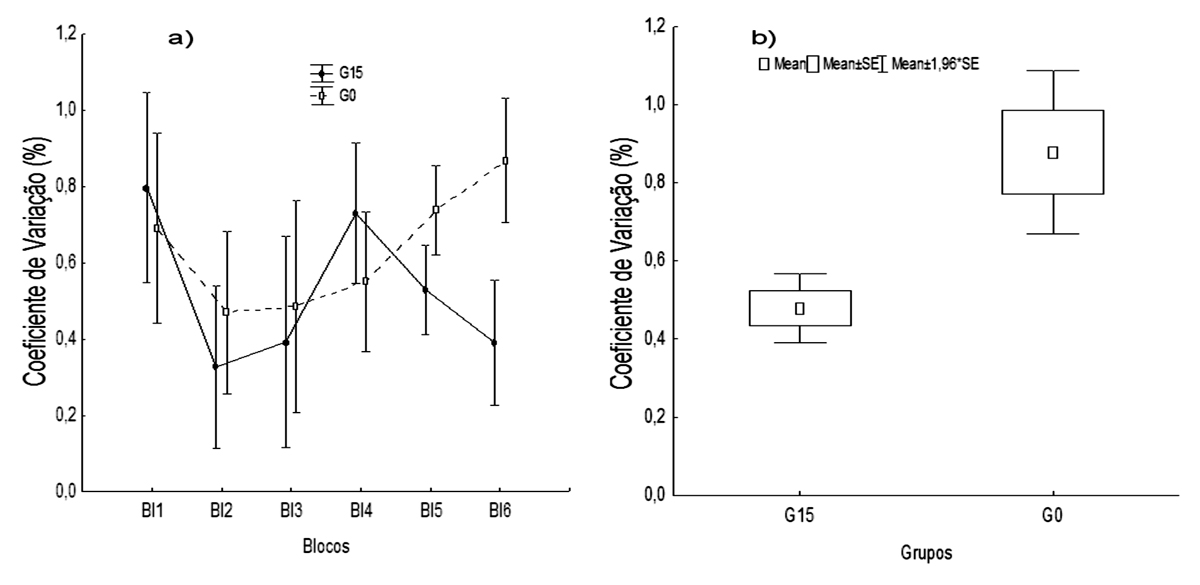 A Figura 2b mostra os dados da consistência do desempenho (CV) no teste de retenção. O teste utilizado mostrou diferença significativa entre grupos, sendo que o G15 foi mais consistente que o G0 t = 3,44, p = 0,001.