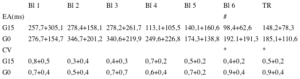 A Figura 2a mostra os dados da consistência do desempenho (CV) na fase de aquisição. O teste utilizado mostrou interação significativa entre grupos e blocos F(5;14) = 3,25, p = 0,008. O post-hoc LSD detectou que o G15 aumentou a consistência do desempenho (p = 0,02) ao longo da fase de aquisição. Já o G0 manteve não teve alteração da consistência ao longo da fase de aquisição (p = 0,05). Ainda, no ultimo bloco da fase de aquisição, o G15 foi mais consistente que o G0 (p = 0,001). Houve também diferença significativa no fator blocos F(5;14) = 4,17, p = 0,001. O post-hoc LSD detectou que a consistência do desempenho aumentou a partir do segundo bloco (p = 0,01). Não houve diferença significante no fator grupos F(1;28) = 1,77, p = 0,19.