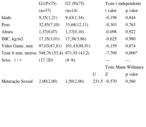 Para a análise dos dados foi utilizada a estatística descritiva e inferencial. Para verificar a normalidade dos dados foi utilizado o teste de Kolmogorov-Smirnov. A amostra foi categorizada em dois grupos de acordo com os escores obtidos no teste de aptidão aeróbio, assumindo como ponto de corte o Percentil 75 (Grupo 1 – Percentil<75 e Grupo 2 – Percentil ≥75, sendo os melhores desempenhos no teste de seis minutos agrupados no G2, n=14). Para verificar a diferença entre os grupos foi utilizado o teste t para grupos independentes para as variáveis com distribuição normal e o teste U Mann Whitney para as variáveis com distribuição não normal. Para analisar a associação entre os valores de aptidão aeróbia com as variáveis de atenção e escores de teste de desempenho escolar, foi utilizada a correlação de Pearson. Para todos os testes foi adotado nível de significância p<0,05 e utilizado o software Statistica 10.0 para Windows.