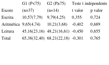 Nenhuma diferença estatisticamente significante foi observada para o teste de desempenho escolar entre os grupos.