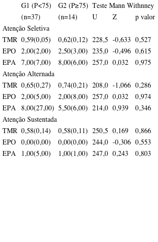 No teste de desempenho escolar (TDE), não foram observadas diferenças estatisticamente significantes entre G1 e G2 na escrita, aritmética e leitura (Tabela 2). De maneira similar, não foram encontradas diferenças estatisticamente significantes no EPO, EPA e TMR nas tarefas da atenção seletiva, alternada e sustentada do TAVIS-4 (Tabela 3).